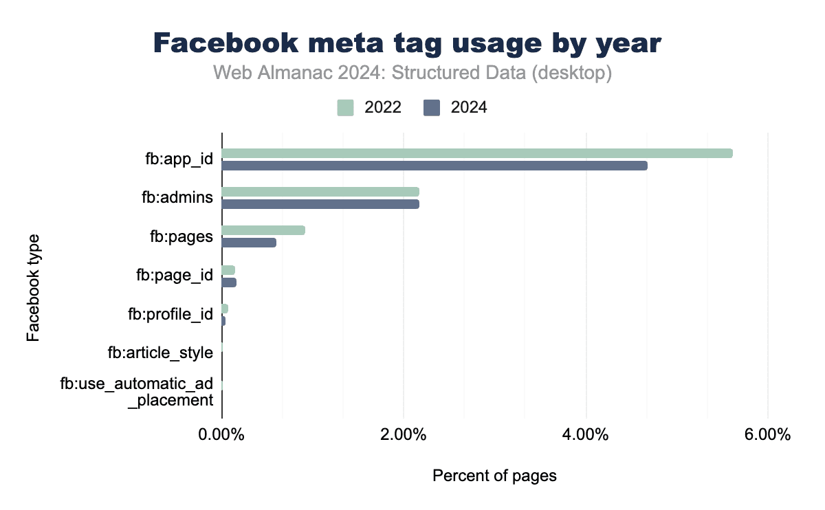 Facebook-specific meta tags have seen a marked decline in usage between 2022 and 2024, reflecting the broader industry shift toward Open Graph as the preferred format for social sharing metadata. The fb:app_id tag, once widely used to integrate apps with the Facebook platform, now appears on only 4.9% of mobile pages, down from previous years. Similarly, administrative tags like fb:admins have dropped to just 2.4%, serving primarily for backend management rather than enhancing content visibility.