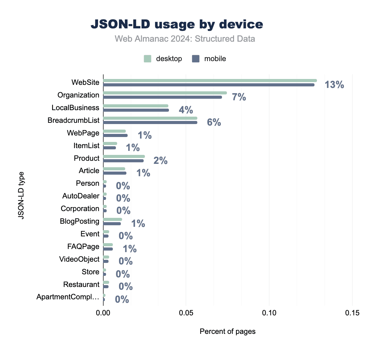 JSON-LD types continue to be widely implemented across websites, with varied types of data used depending on the purpose of the site. The WebSite schema leads adoption, appearing on 12.73% of mobile pages, followed by Organization and LocalBusiness types at 7.16% and 3.97%, respectively. These types are crucial for establishing entity identity and providing contextual information to search engines.