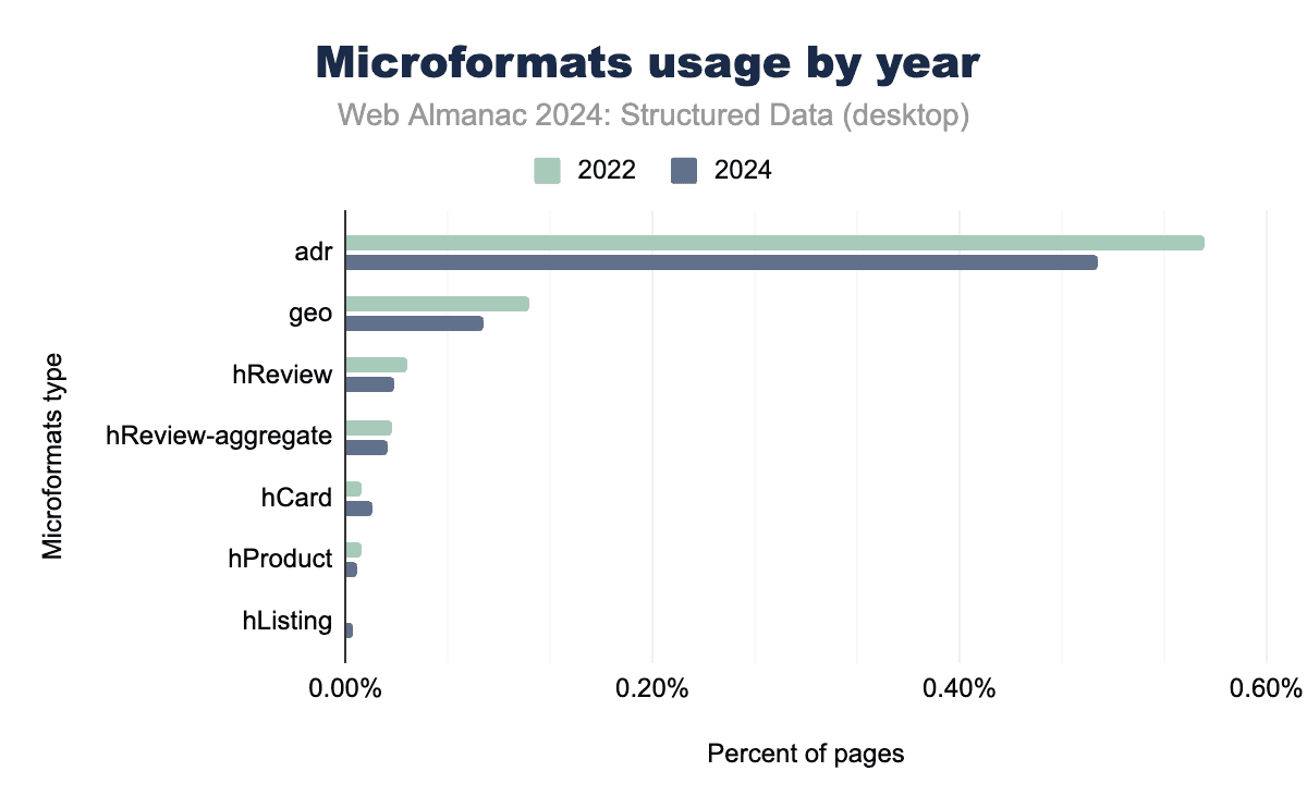 Microformats continue to show limited adoption, primarily in niche use cases where simple, semantic data is required. The adr tag, used for address-related data, remains the most widely adopted Microformats type, appearing on approximately 0.4% of pages across both mobile and desktop platforms. Other tags, such as geo and hReview, have minimal usage, as more sophisticated formats like JSON-LD and Open Graph have become more prevalent.