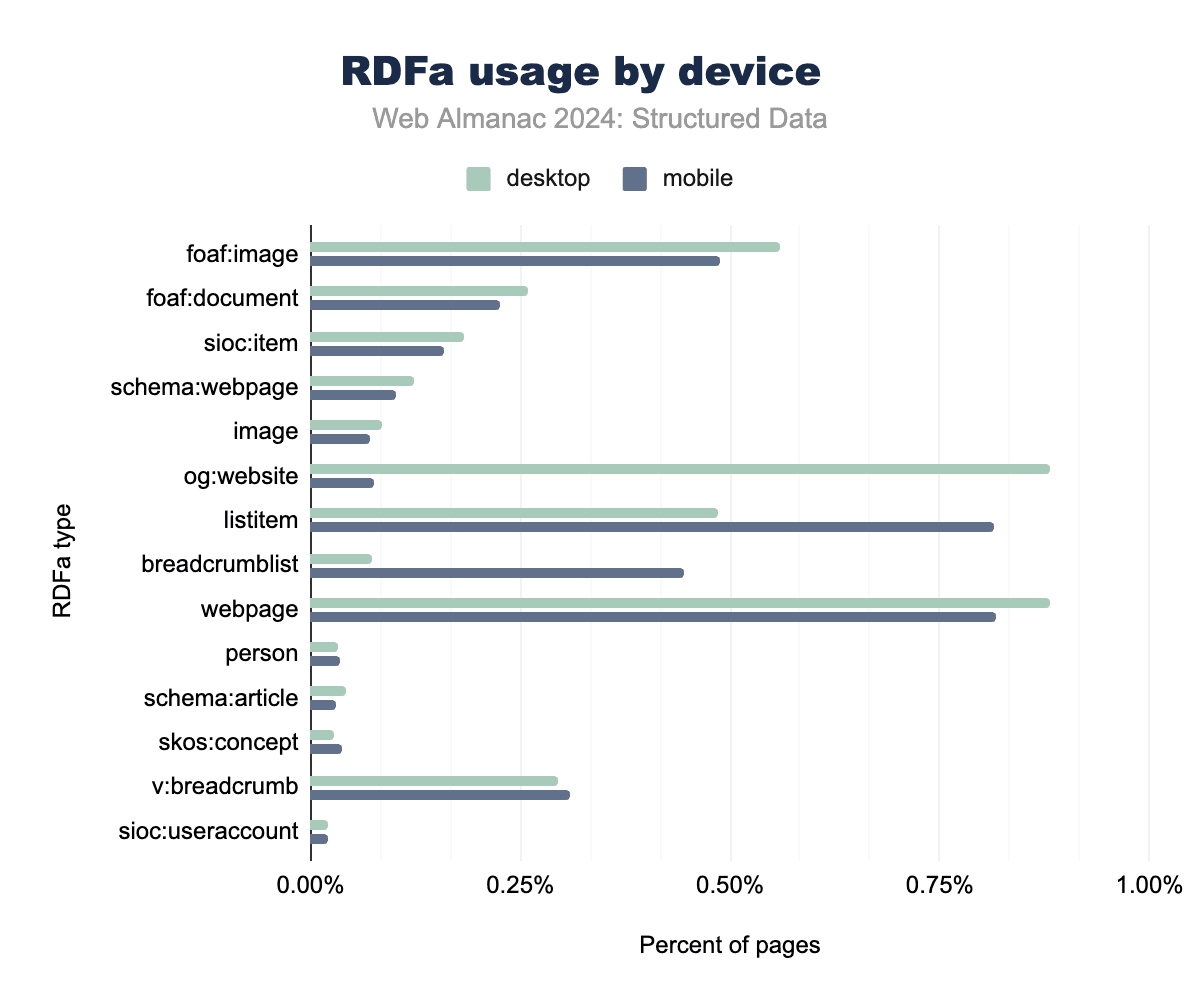 Microformats2, while still relatively niche, has seen slightly higher adoption than its predecessor. Tags like h-entry and h-card, which are used for blogging and personal identity data, now appear on 0.22% of mobile pages and 0.15% of desktop pages. These tags continue to serve specific needs, particularly for address data and simple content structures.