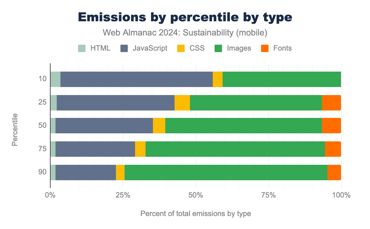 We can also take a look at the share of emissions for different resources (HTML/JS/CSS/images/fonts), distinguishing mobile and desktop:
