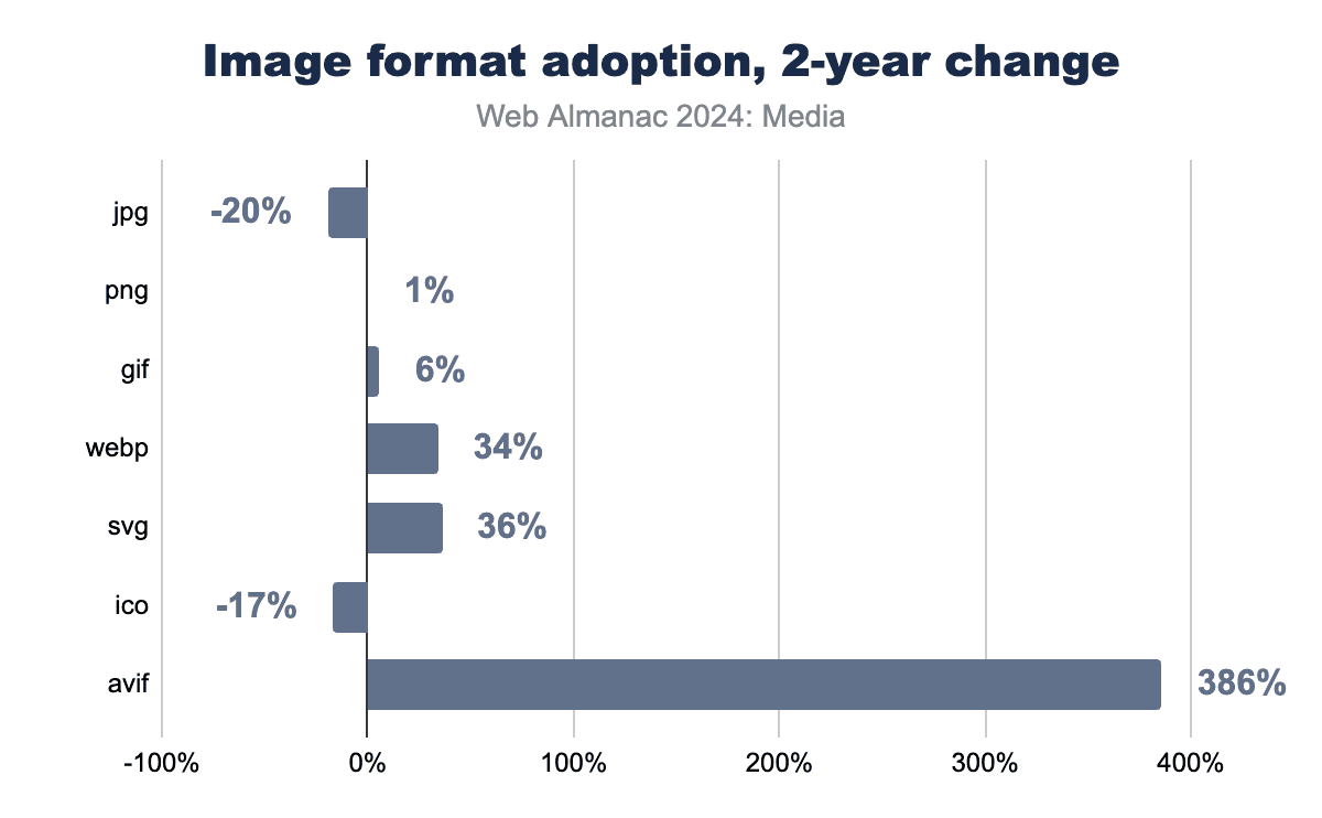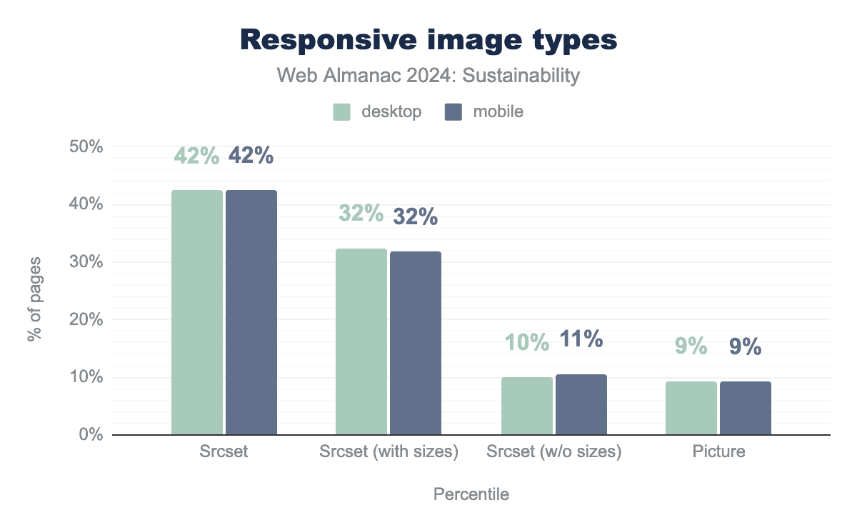 From the 90th percentile of collected data, it is clear that the largest portion, more than half of the page’s total weight, belongs to images. This is quite an expected result and one of the parts where small optimizations can have the biggest impact. Slightly surprising and worrying is that there is still a very small gap between desktop and mobile numbers, not only in images but across all types. This shows us that even though mobile-first became a concept over 15 years ago, most teams still don’t optimize their mobile sites to account for the limitations of mobile networks, phone plans, and smaller screens (for which smaller images are usually enough). In the end, it may look mobile-friendly, but the experience isn’t.