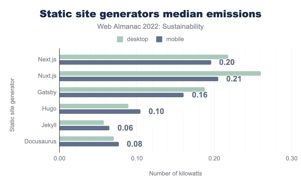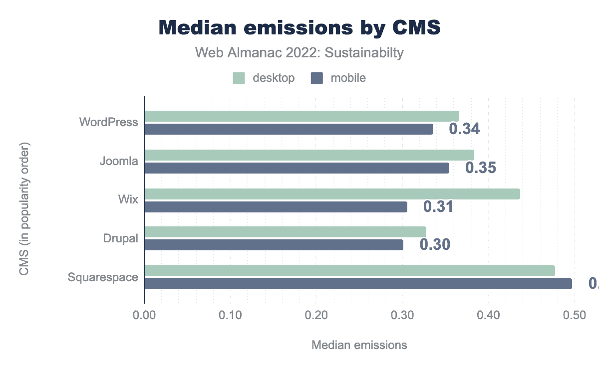 The average of the median emissions in the chart above is about 0.3 grams of carbon. To run these queries on seven million URLs would produce about 2125 kg of CO2. That’s just from sampling the top five CMS. We know that this is just a small sampling of the CO2 produced through the use of these websites.