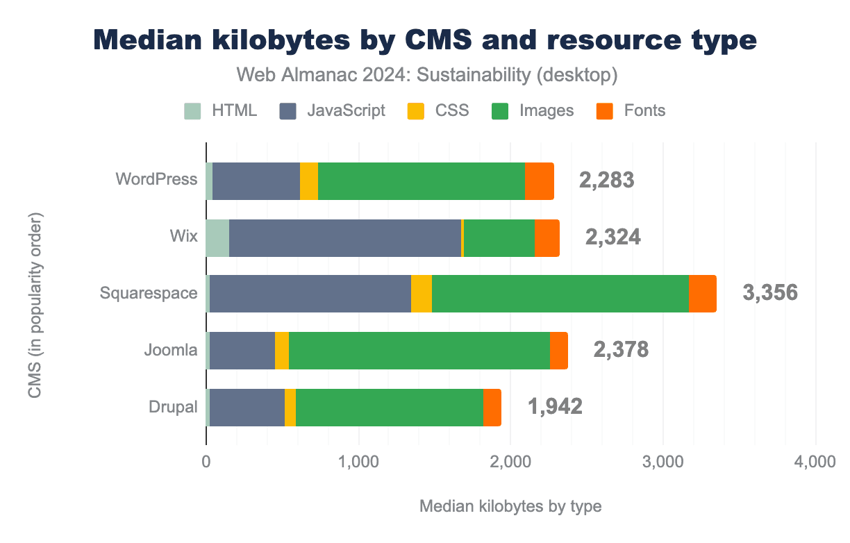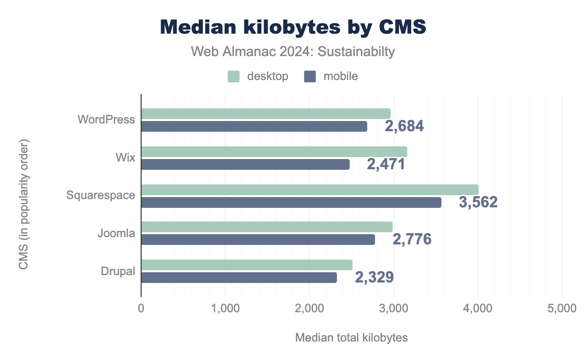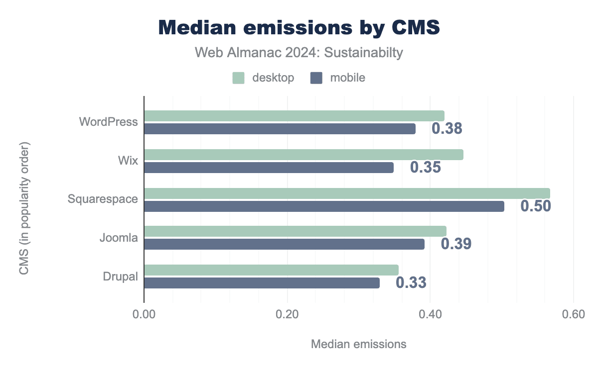 Notably, all report a median mobile page weight above the overall median of 2 MB. Comparing these values to their 2022 median size demonstrates that most websites built with each CMS are heavier than they were 2 years ago, which confirms a tendency that we noticed on global emissions for all pages. The more significant growth is for Squarespace websites on desktop and Drupal still seems to fare better than others (even if there is room for improvement).