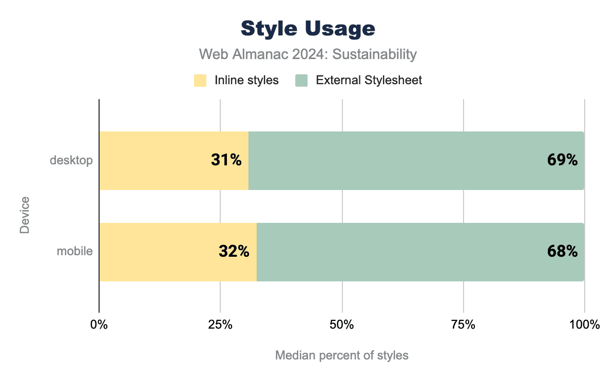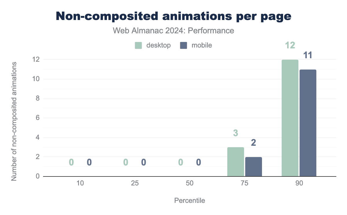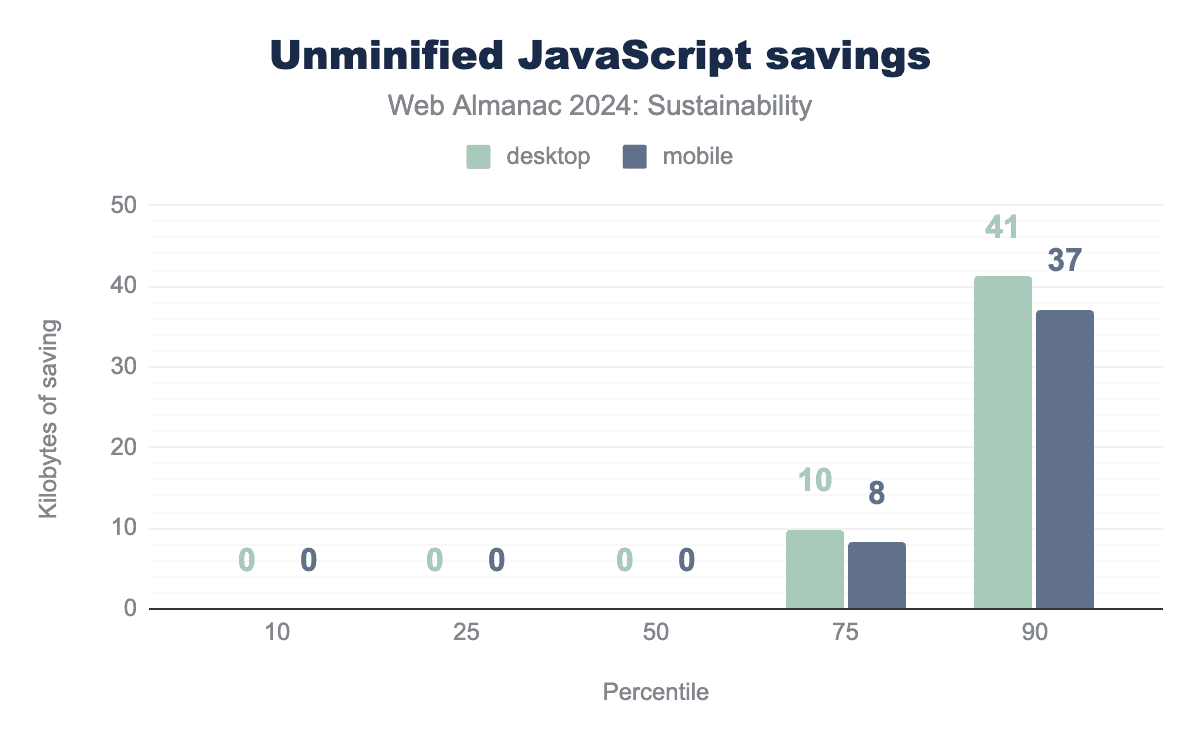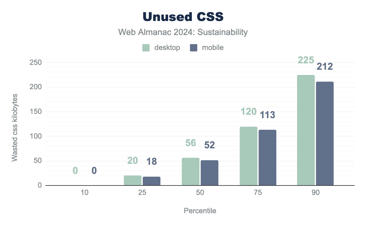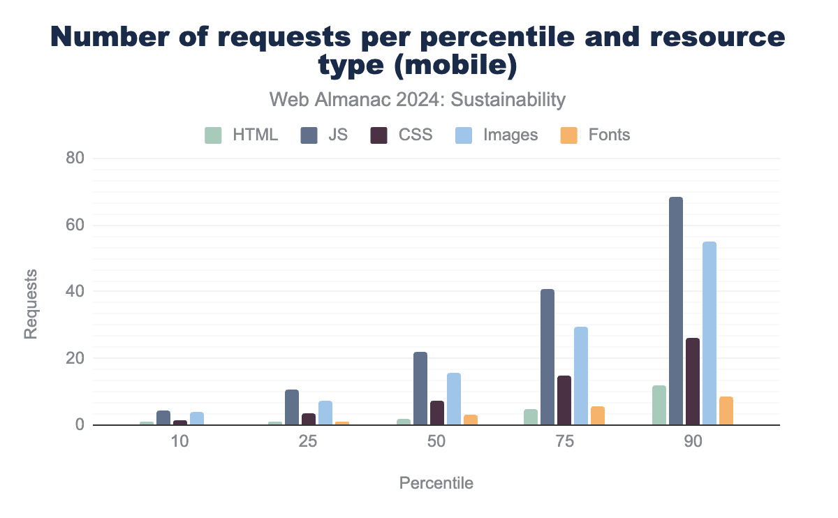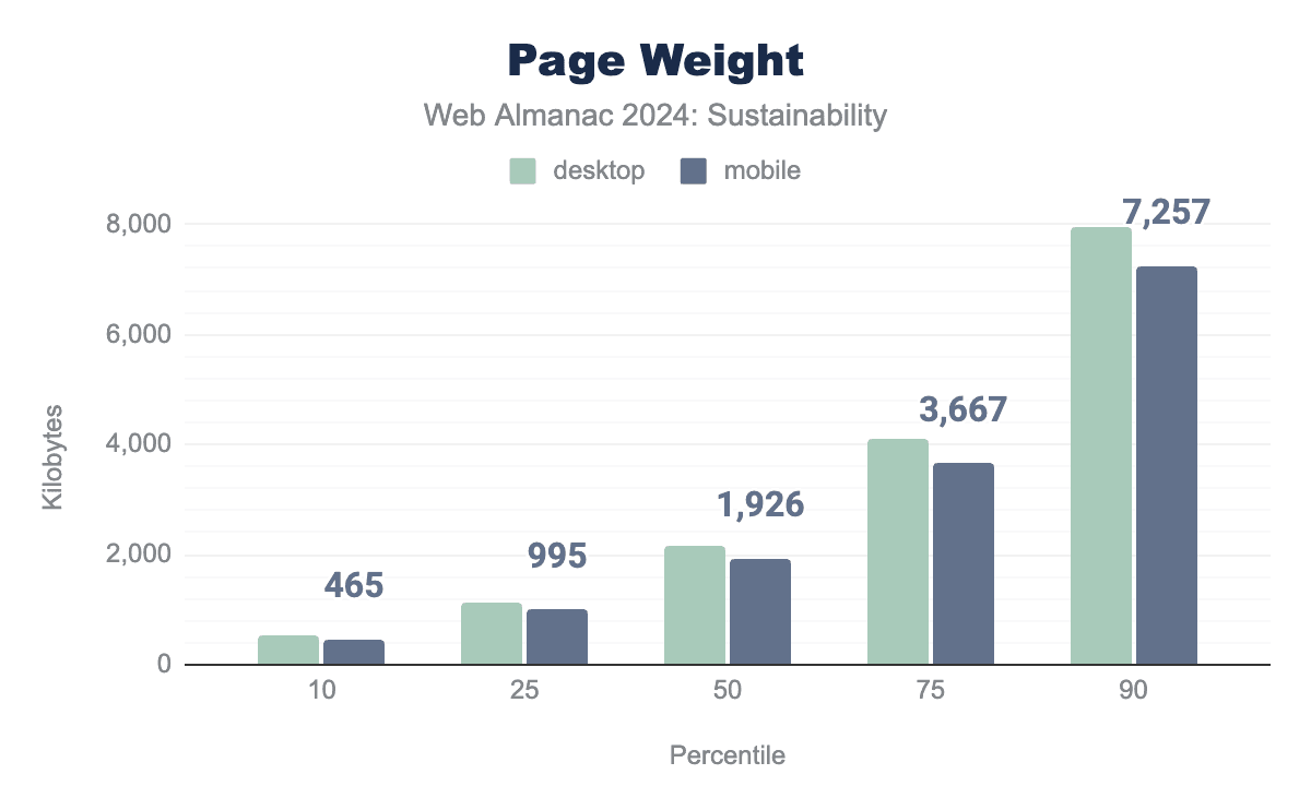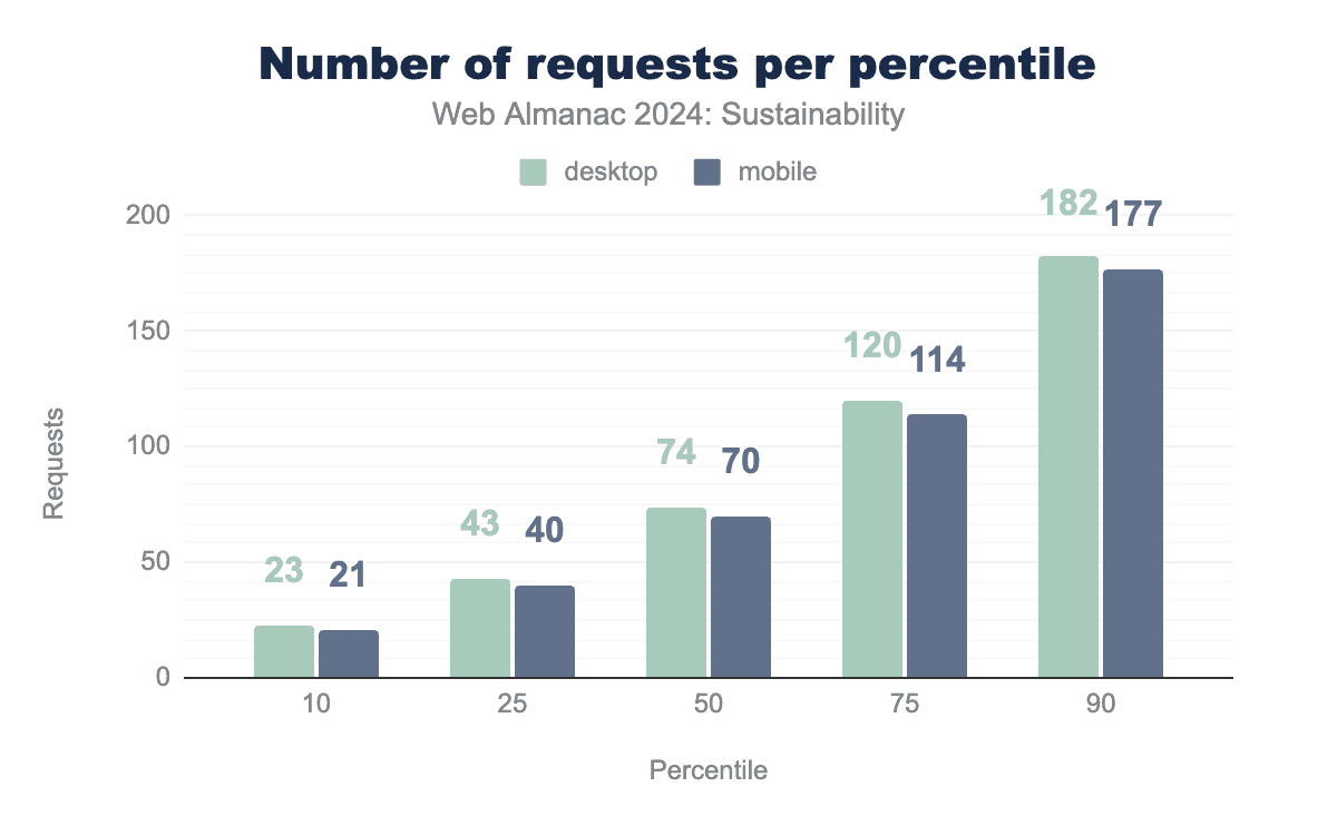 Page weight represents the amount of data transferred to access the web page (based only on HTTP requests). It is recommended that this metric be kept as low as possible to ensure a fast load and good user experience for all users. On the 90th percentile, the average mobile site weighs around 7.2 MB, while desktop ones are around 8 MB. The good news is that these numbers are slightly lower than the ones in the 2022 Almanac. The bad news is that these numbers are still way too high. When we talk about sustainability, we usually touch upon inclusion, and to make sure the majority of Internet users can access the page and have a decent user experience, page weight should be kept below 1MB, ideally around 500KB.