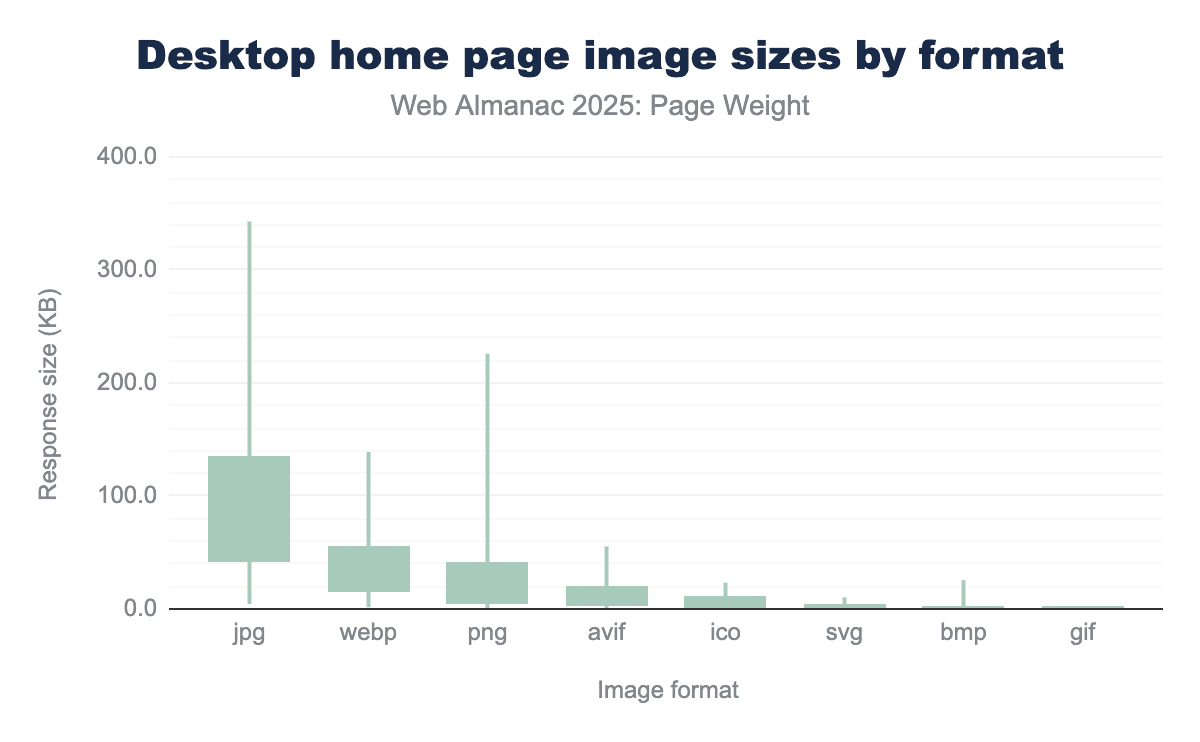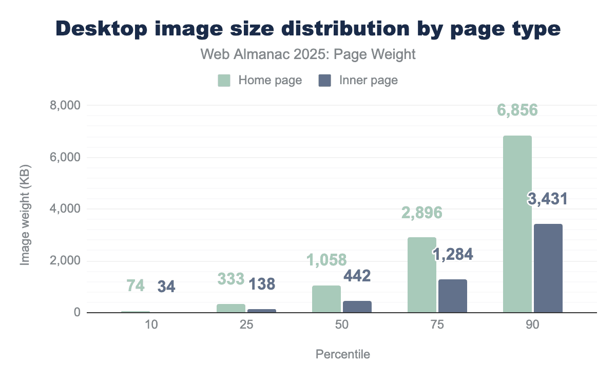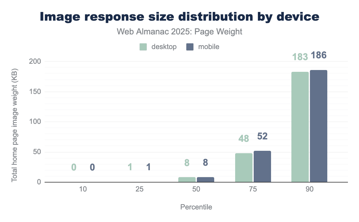 A web page rarely uses a single image. When aggregated together, the median desktop page used 1,059 KB of images. Mobile pages used 911 KB. Desktop pages consistently loaded more total image bytes.