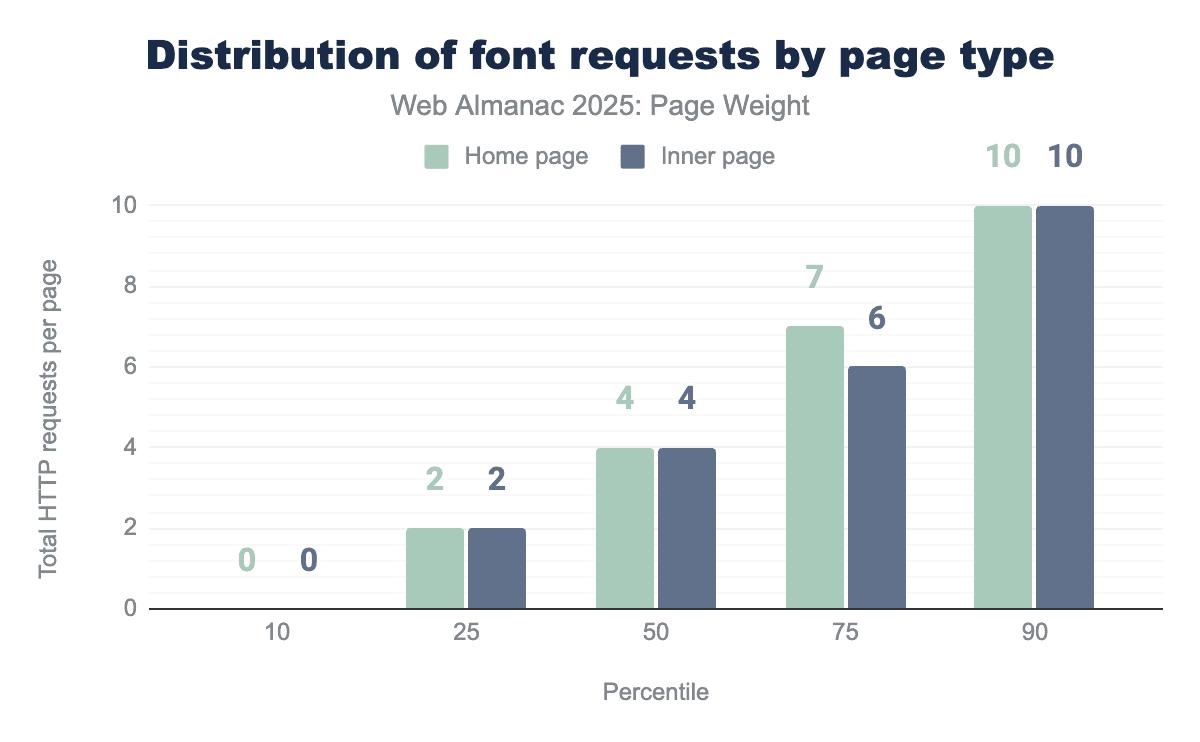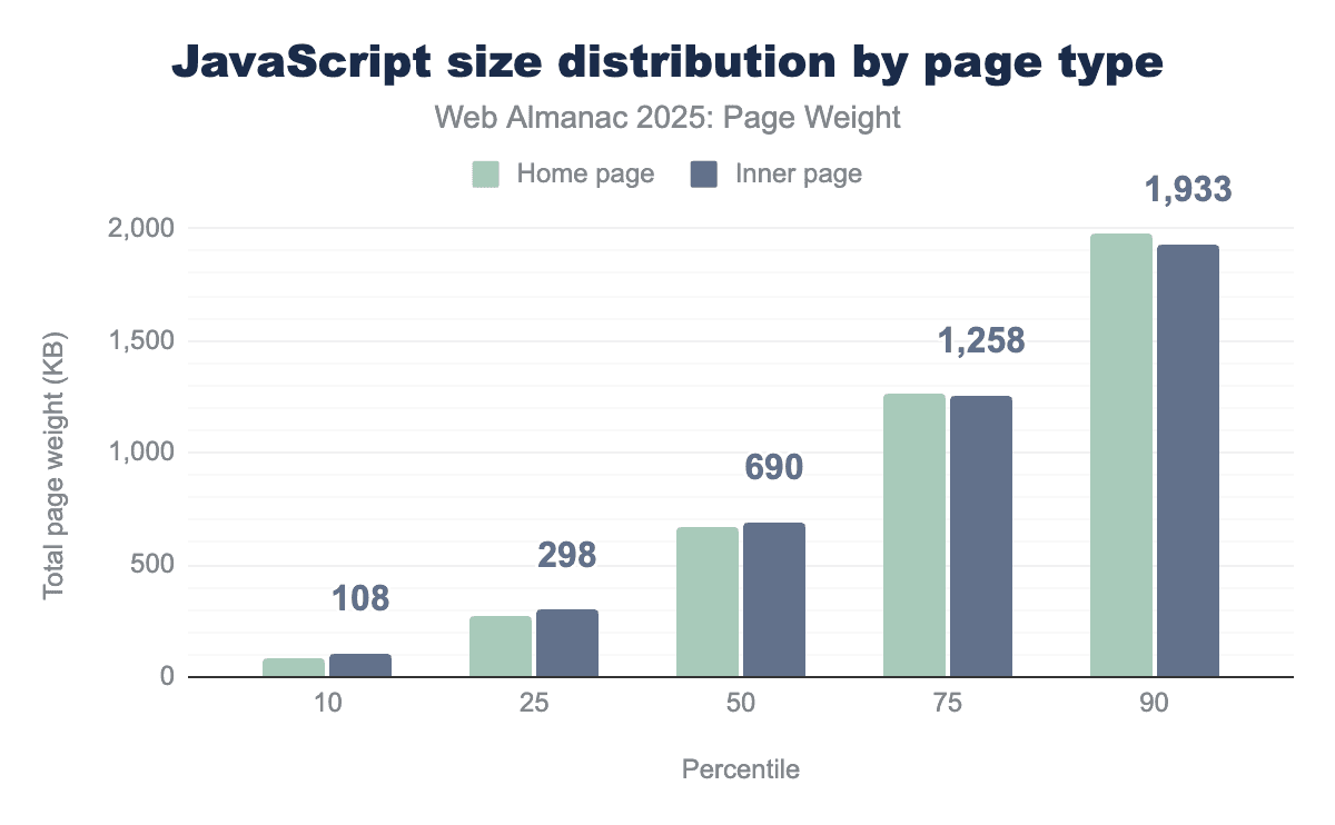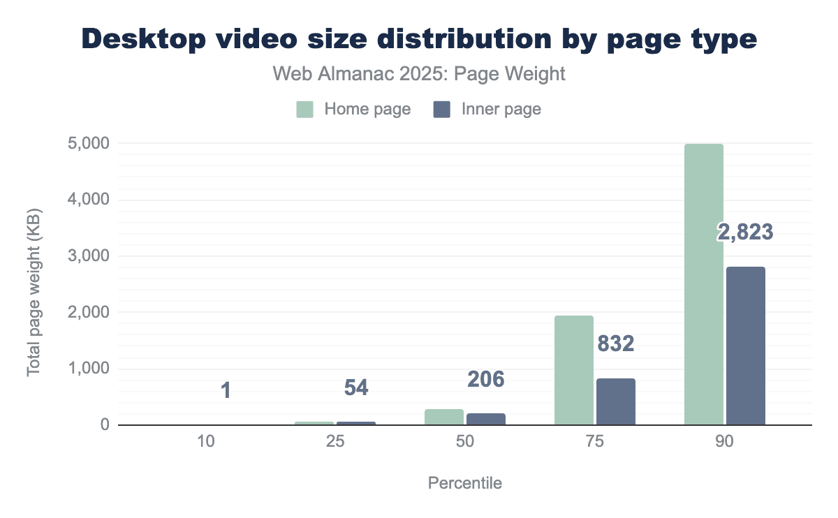 As observed above, inner pages tend to be lighter than home pages. In 2025, the median home page weighted 2.9 MB for desktop and 2.6 MB for mobile. Inner pages were lighter in comparison, with median sizes of 1.8 MB for mobile, and 2 MB for desktop.