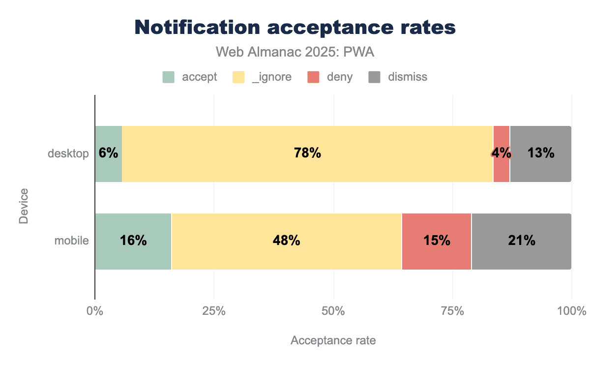 Desktop notification acceptance is overwhelmingly ignored: 78% of them are disregarded, with a slightly lower but still meaningful 48% on mobile. This is not a surprise considering overall the notification fatigue users deal with on a regular basis.